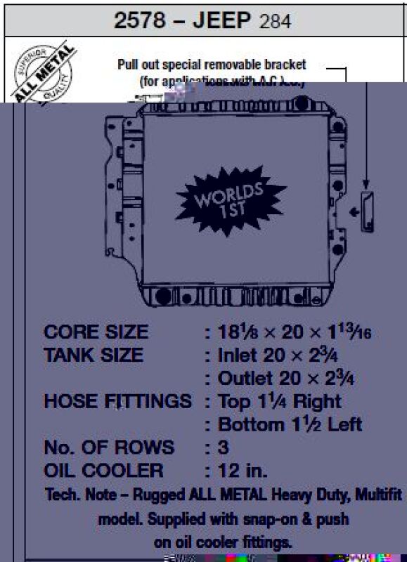 World exclusive multi-fit model, only from CSF - fits all automatic and manual Wrangler YJ and TJ models. CSF's #1 selling copper/brass Jeep model with over 20,000 sold - a cult favorite among Jeep enthusiasts who wish to keep their original style copper/brass radiator, but desire higher performance and more durability. CSF has over 5 decades of experience manufacturing radiators. So when it comes to keeping your engine cool and your Wrangler running at its finest, a CSF Heavy-Duty Radiator is the obvious choice. CSF has spent years refining and improving their radiator designs. The original style copper/brass construction features ribbed brass end tanks for additional strength and reinforced side end plates and integrated metal core straps to withstand heavy vibration and chassis flex while off-roading. The 3-Row 46mm Heavy-Duty and High-Performance Copper Core offers the best cooling available in a design that is a true "drop-in" fit with no modifications necessary for installation. Whether you are off-roading, towing, or just casually driving your Wrangler, trust the cooling experts at CSF for the best performing, high-quality, and reliable radiators.