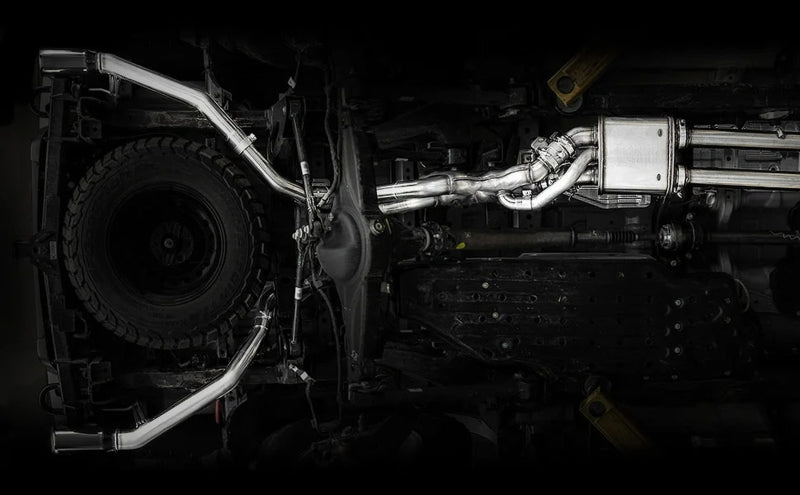 The MagnaFlow 2024 Ford Ranger Raptor Competition Series Cat-Back Performance Exhaust System 19637 brings an aggressive, attention-grabbing edge to the deep resonant exhaust note we're so well known for. This cat-back exhaust kit is designed to enhance your 3.0L V6 2024 Ford Ranger Raptor with dyno-proven performance made possible thanks to fast-flowing mandrel bent 3in. diameter piping that passes a straight-through muffler ending in a dual rear exit with 4in. welded-on double wall angle cut folded edge tips featuring a sporty black chrome finish. Exhaust system 19637’s cat-back layout replaces your truck's exhaust system from the catalytic converter on back with a weight-optimized, corrosion resistant, and durable stainless-steel design. Our Tech Center team has worked diligently to ensure that the fully functional Magnaflow valves included in this kit seamlessly integrate with the factory drive mode selections in your Ranger Raptor. This race-ready exhaust system is engineered to make your Ford Ranger Raptor's V6 engine produce moderate interior and aggressive exterior sound levels. Extensive 3D scanning was used during the development of this Ford Ranger Raptor exhaust system to create a direct-fit design, enabling a do-it-yourself installation process. Exhaust system 19637 is produced using advanced CNC precision robotic manufacturing techniques and backed by MagnaFlow's limited lifetime warranty. Please check to ensure compliance with local noise regulations.