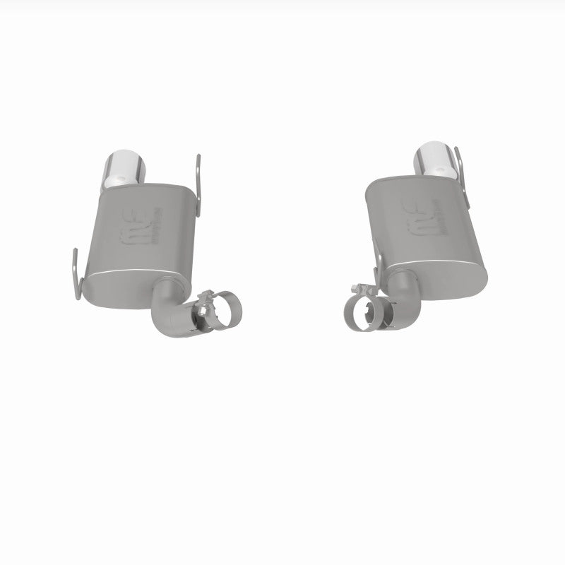 The MagnaFlow 2005-2009 Ford Mustang Street Series Axle-Back Performance Exhaust System 15882 brings enhanced engine sound and dyno-proven performance to your 4.6L, 5.4L 2005-2009 Ford Mustang with a healthy helping of our deep, resonant signature exhaust note at Moderate exterior and Mild interior sound levels. Thanks to its durable, corrosion resistant stainless steel design, this Ford Mustang exhaust system will handle whatever tarmac you decide to leave your mark on. This performance exhaust kit features an axle-back layout designed to replace your Ford Mustang's exhaust system from near the rear axle on back. With its fast-flowing, mandrel bent 2.5in. main piping and 2 Straight-Through mufflers ending in a Dual Split Rear exit with 4in. Polished Welded-On Double Wall Angle Cut Rolled Edge tips, your ride will be sounding as awesome as it looks. Extensive 3D scanning during development has resulted in a direct-fit design that you can easily install yourself. 15882 is produced using CNC precision robotic manufacturing techniques and is backed by MagnaFlow's 1-year limited finish warranty and limited lifetime construction warranty.